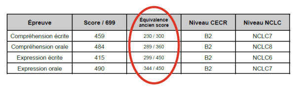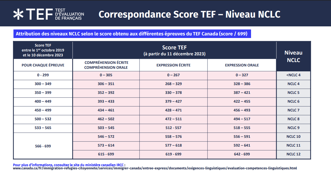 The TEF scoring system is also aligned with the Canadian Language Benchmarks (Niveaux de compétence linguistique canadiens – NCLC). TEF Canada certificates indicate the NCLC level achieved for each test component.